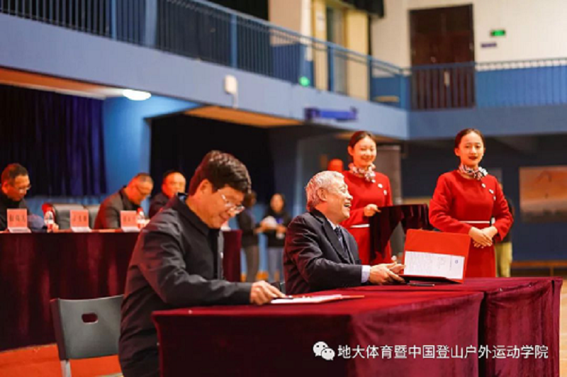 副校长傅安洲同志在现场共同签署了《中国登山户外运动学院共建协议》、《登山运动史料整理、利用合作协议》;