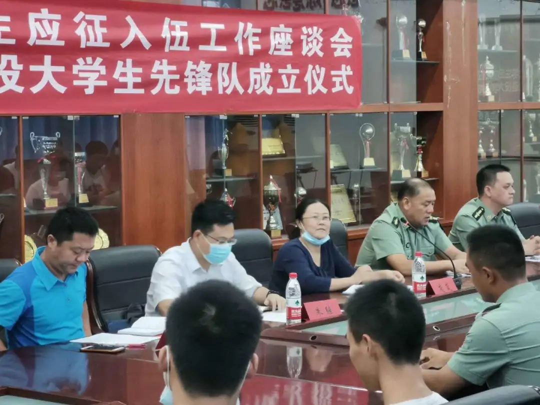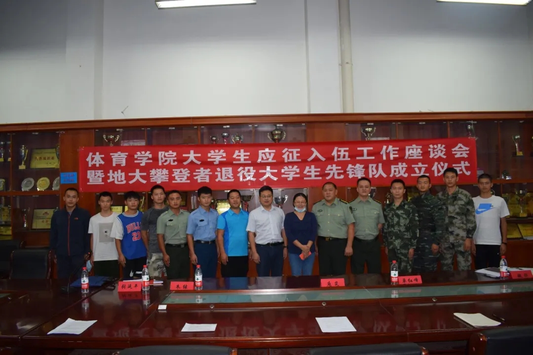 2020年9月10日15:00,私房tv 在体育馆二楼会议室召开了私房tv 大学生参军应征工作座谈会暨地大攀登者退役大学生先锋队成立仪式。出席此次会议的领导有武装部副部长单红峰,学工部副部长朱继,武装部老师魏刚,私房tv 党总支书记庞岚,私房tv 党总支副书记张延平。参与本次会议的人员有私房tv 在校的退役大学生和2020年应征入伍学生,以及私房tv 部分同学。会议由131181班的陈岳峰同学主持。