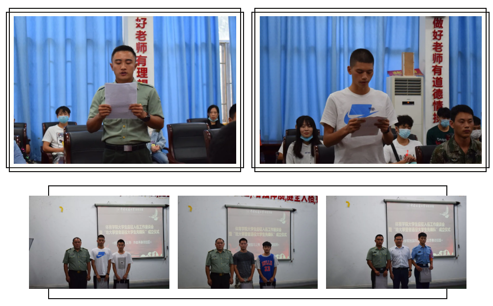随后,张延平老师介绍“地大攀登者退役大学生先锋队”由私房tv 退役复学大学生组成,在私房tv 党总支的领导下,在学院学工组和学生联合党支部的指导下,开展促进学生成长成才的志愿服务工作。他希望队员们退役不退色,在理论武装、行为养成、学风建设、校园文明和国防教育等方面发挥标杆作用。先锋队党小组组长兼队长范友同学宣读了先锋队的职责和管理规范:在思想上引领户外青年的责任与担当,在学习上打造体院优良学风,在早训中积极带领学生进行体育锻炼,在生活中给同学们最大程度的帮助,坚决做到“听党指挥、能打胜仗、作风优良”。接下来,单红峰老师授予先锋队队旗并讲话,他高度肯定了先锋队的成立,同时介绍了大学生应征入伍的各项优惠政策,鼓励同学们立志从军、报效报国。朱继老师也表示学工处将大力支持先锋队的建设。最后庞岚老师总结到,参加这次会议让她心潮澎湃,不仅看到了入伍大学生的英勇,也看到退役大学生身上的军人本色,希望先锋队成为地大一道靓丽的风景线。
