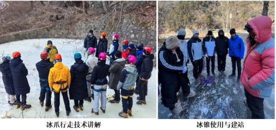 实习首日,尽管寒风凛冽,但是同学们热情高涨。在李伦老师和周云老师的指导下,大家在初级攀冰训练场逐步学习攀冰和打冰锥的基本技巧。李伦老师层层递进教会我们如何使用冰锥及建站,周云老师详细讲解了冰镐、冰爪的使用方法,以及如何实用冰爪行走。同学们全神贯注,认真模仿每一个动作,不放过任何一个细节。