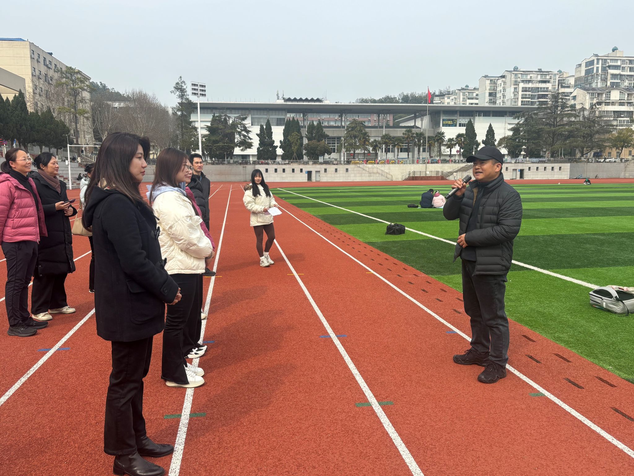 热身环节中,体育专业研究生带领全体参与人员开展趣味热身操—兔子舞,简单的拉伸与关节活动,不仅有效避免了运动损伤,更充分调动起现场氛围,欢声笑语此起彼伏。