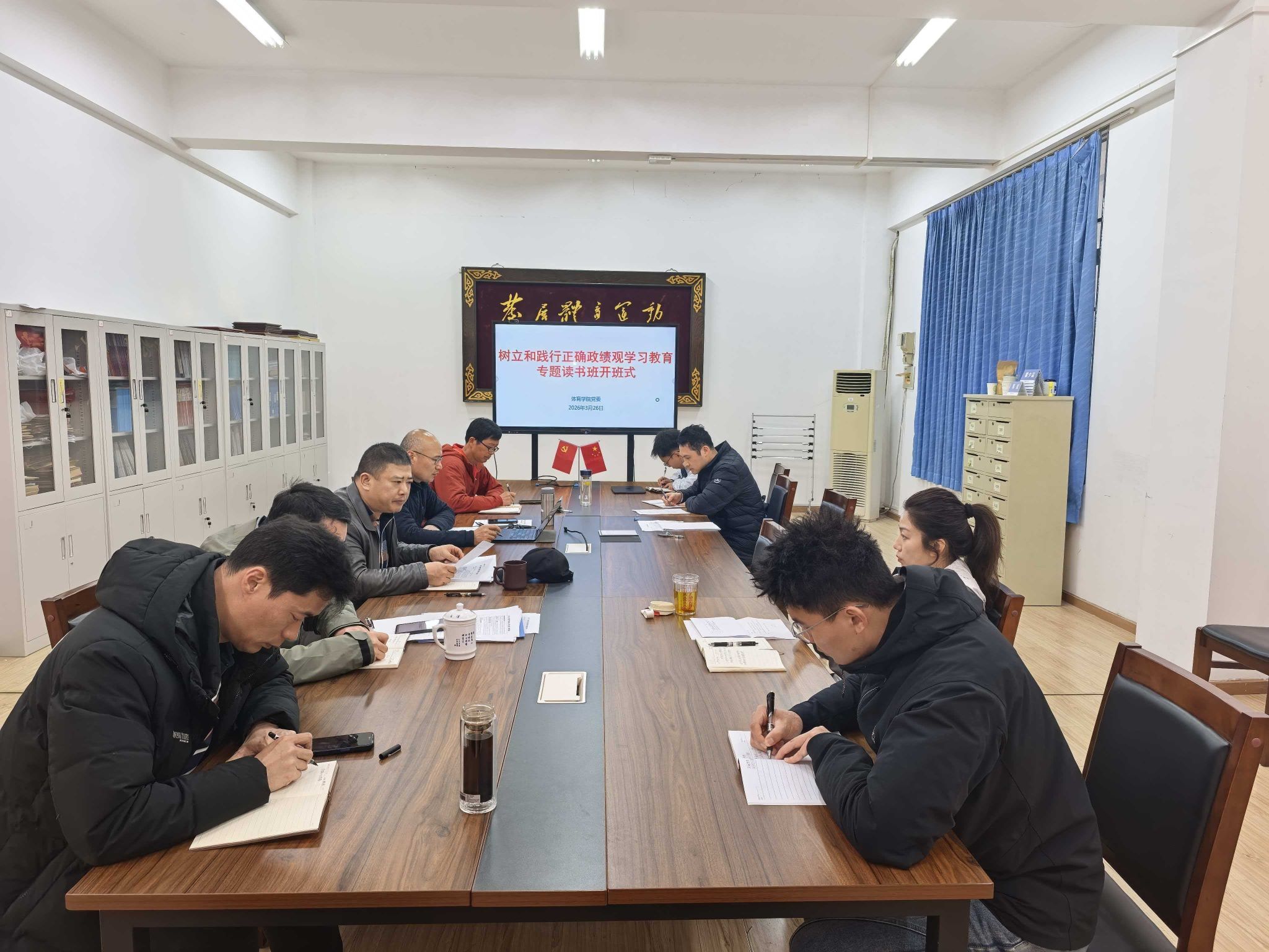 (通讯员:江伟贤)为深入学习领会习近平总书记关于树立和践行正确政绩观的重要论述,推动学院党员领导干部政治能力和理论素养持续提升,私房tv 党委理论学习中心组于2026年3月26日下午在体育馆党员之家举行“树立和践行正确政绩观学习教育专题读书班”开班仪式。开班仪式由学院党委书记何建新主持,学院全体党委委员、师生党支部书记参加学习。