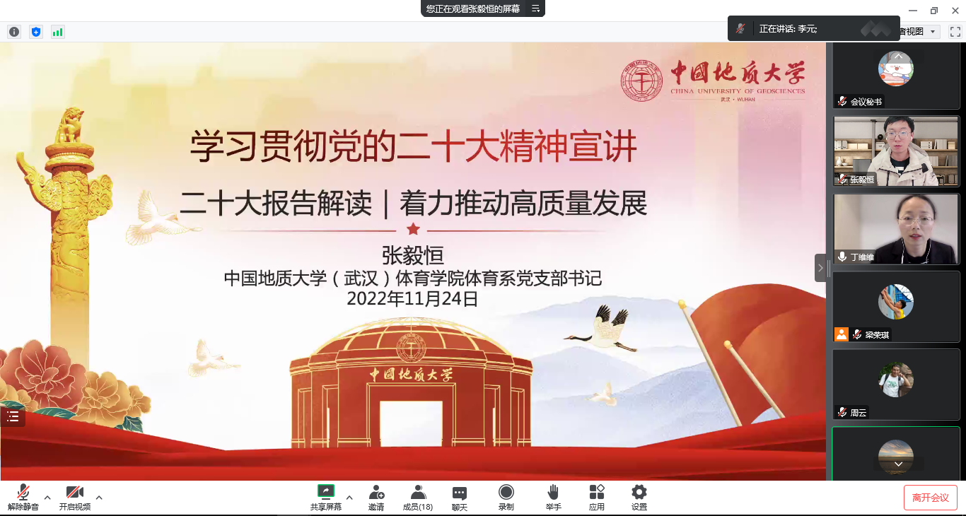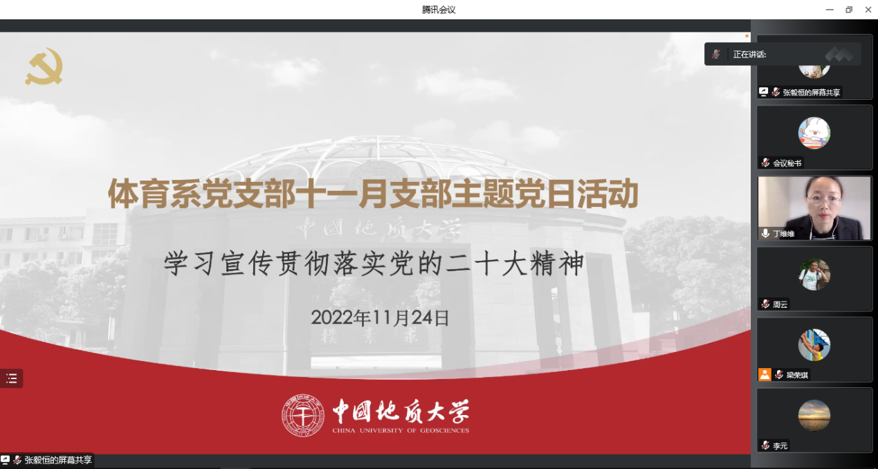 (通讯员:丁维维)11月24日下午,私房tv 体育系党支部组织开展题为“学习宣传贯彻落实党的二十大精神”的主题党日和廉政党课活动。本次学习活动通过线上形式进行,由支部宣传委员丁维维同志主持。